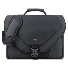 Laptop messenger bag features a main compartment with a padded sleeve that holds 17" laptops. A large adjustable speed buckle secures the front flap. Ride Along Pocket allows bag to slip over telescoping handle system for consolidated travel. Uniquely styled shoulder strap is adjustable and removable and features a nonslip pad. Messenger bag offers organizer and accessory pockets under the front flap and full-length, zippered main pocket under flap.
