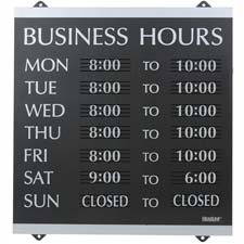 Business Hours Sign offers a heavy-duty plastic construction. Included suction cups and a complete set of 176 characters (3/4") let you customize your business hours. Hooks on bottom let you attach an optional U.S. Stamp & Sign Century Series Open/Closed Sign (sold separately).