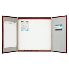 Scratch-resistant and stain-resistant laminate conference room cabinets feature magnetic white premium porcelain writing panel, fabric-covered bulletin doors and pad holders. Magnetic premium porcelain surface is easy to write on and erase, and also accepts magnetic accessories. Lasts a lifetime, durable porcelain won't dent or scratch. Stain-resistant, easy to clean surface looks new for years. Magnetic closures and full-length hinges allow the doors to open and close smoothly. Includes four assorted Quartet dry-erase markers, an eraser and magnets.