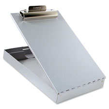 Portable desktop provides a hard surface for readable work and a 1-1/2" storage compartment underneath clipboard cover with separate section for pens and pencils. Antimicrobial additive effectively reduces the formation of bacteria and fungi on this portable desktop. Self-locking latch keeps the compartment securely fastened. High-capacity clip holds up to 1" paper and includes a built-in license/card holder. Form holder is made of aluminum with a high percentage of recycled material.