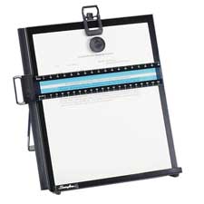 Metal Letter-Size Copyholder features a clear line guide that can be positioned on sides or top of document. Magnet keeps copy from slipping. Clip at top to accommodate a steno book. Nonmagnetic highlighting line guide includes a pica/elite gauge, inch/centimeter ruler, and sturdy plastic outer frame. Adjustable easel stand folds flat for space-saving storage. Copyholder is made of heavy-gauge steel. Nonmar rubber feet stay put and protect worksurface. Copyholder includes a book lip, magnet and paper clip.