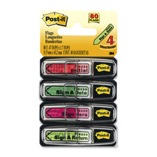 Post-it Printed Message Flags make it simple to request action. Ideal for marking documents without writing on them. Each flag sticks securely, repositions easily and removes cleanly. Bold arrow points precisely where you need a document signed. Dispenses one flag at a time. The Signature Flag Set includes colorful flags that read "Please Initial," "Please Sign and Date," "Please Sign Here" and "Please Sign & Return."