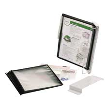 Ergonomic reference system keeps important documents at your fingertips, off of your desk and at eye level. Design is angled at 15 degrees for a better view while standing. All-metal unit features sleeves and custom index kit with removable sections. Nonglare sleeves offer two-sided viewing of letter-size documents and can be photocopied in the sleeve. Set includes 12 two-sided heavy-gauge polypropylene sleeves (24 view facings), 12 snap-on custom indexing tabs, chrome wings, solid metal section and mounting plate. Easy installation kit includes double-sided tape, hook-and-loop closure and screws.