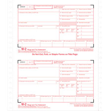 Carbonless, continuous W-2 tax forms are used to payment for services performed by an employee to the Social Security Administration. Forms meet IRS specifications. Each set of forms includes a W-3 Transmittal of Income Wage and Tax Statement Form. Detached size is 8-1/2" x 5-1/2". Forms are designed for use in dot matrix printers.