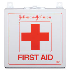 First Aid Kit contains 155 Band-Aid adhesive bandages, 20 antiseptic wipes, 12 Tylenol Ex-Strength caplets, 20 first aid nonstick pads, six burn cream packets, two oval eye pads, one pair of health-care nonlatex gloves, one surgical wound dressing, two 2" Kling gauze packets, one first aid tape, one triangular bandage, scissors, tweezers, one cold pack, one elastic bandage and first aid guide. Ideal for use in office, home, restaurants, warehouses, light manufacturing and more. Metal shell case can be mounted to a wall. Kit contains 227 pieces for up to 50 people.