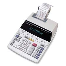 Large printing calculator features large 12-digit blue fluorescent display and tax keys. Prints 3.0 lines per second in two colors (positive numbers in black, negative numbers in red) on standard-size paper rolls. Calculator offers four-key memory, grand total, markup, cost/sell/margin calculations, percent changes, automatic add-on/discounts, up/off/down rounding settings, item counter and floating or fixed decimal (6,3,2,1,0). Weighs 2.9 lb. AC operation.