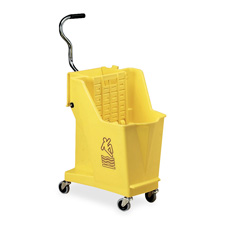 Mopping system is designed for easier, more effective wringing to reduce back strain and operator fatigue. Molded of nonporous plastic for easy cleaning. Sediment screen traps dirt to keep water cleaner longer. Bucket bottom slopes to ensure complete drainage through self-draining spigot and rolls on 3" ball-bearing casters. Mopping system includes built-in mop stick holder and labor-saving tool holders. International caution symbols are printed in bright red on OSHA-required bright yellow. Bucket holds up to 35 quarts.