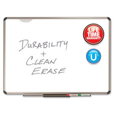 Magnetic porcelain board is part of Quartet Euro Prestige Plus line of premium boards. Ideal for high-profile conference rooms, executive offices and other heavy-use environments. The DuraMax Porcelain will not scratch or dent with heavy use. Easy-to-maintain Total Erase surface will not stain or ghost. The steel-backed porcelain creates a magnetic surface so it can be used as bulletin board and dry-erase board. An easy-to-use corner cap mounting system holds the board tightly to the wall in four places. Attached marker tray conveniently stores markers and accessories. Quick Clips allow you to post documents without magnets. Board includes aluminum frame with titanium finish and four Quartet dry-erase markers.