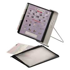 Reference system is ideal for displaying memos, price sheets, calendars, phone lists, graphs, charts and more on your desktop. Versatile system keeps important information at your fingertips. Nonglare sleeves offer two-sided viewing of letter-size documents and can be photocopied in the sleeve. Design is angled at 60 degrees for easy desktop viewing. Self-contained system includes an all-steel base, polypropylene sleeves, and custom indexing kit.