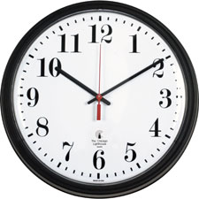 Quartz clock features a high-impact black case, easy-to-read white dial face, and clear crystal with UV protection. The clock face offers a 12" diameter. Clock includes hanging hardware and runs on one AA battery (sold separately). Clock body is made with recycled material and is biodegradable.