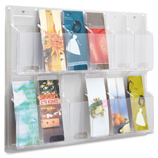 Display rack features 12 pamphlet pockets. Each pocket holds up to 1-3/4" of material. Unobtrusive, break-resistant, crystal clear plastic rack blends into any office environment. Display insert keeps magazines, pamphlets and other literature straightened while preventing curling and flopping of pocket contents. Thermoformed one-piece units have no sharp edges or corners. Use included hardware to mount to a wall. Each pamphlet pocket is 4-1/4" wide x 9-3/8" high. Display rack weighs 6 lb.