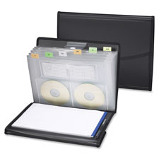 Handy padfolio includes seven-pocket expanding file with flap to secure contents. Two generous pockets hold CDs or other loose items. Padfolio includes two index card/business card pockets and elastic pen loop. Letter-size, ruled pad can be inserted two different ways, making the item perfect for left-handed or right-handed users. Entire padfolio is secured with hook-and-loop closure.