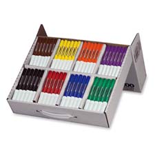 Master pack of conical tip markers includes 25 each of the following colors: red, orange, yellow, green, violet, purple, brown and black. Special washable ink formula doesn't dry out even if cap is left off for 24 hours. Ideal for the classroom and the art room. Certified AP nontoxic.