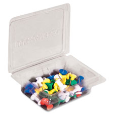 Pushpin caddy holds 40 clear colored pushpins in a convenient clear tub. Smooth, extended plastic heads and sharp points allow easy insertion and removal. Attach caddy to any cork surface for easy access.
