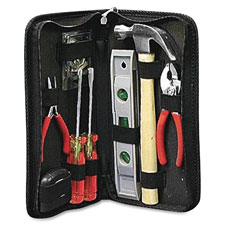 High-quality tool kit is great for office or home use. Kit includes 4" long-nose pliers, 6" slip-joint pliers, 4" straight screwdriver, No. 2 Phillips screwdriver, 8" torpedo level, 7 oz. wood claw hammer and a 12' tape measure. Rugged, soft-sided case with a zipper keeps your tools together and organized.