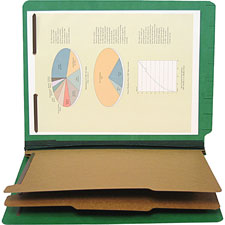Classification folder features six separate sections for use with open shelf filing systems. Full cut end tab is undercut for extra visibility and marked for easy application of color-coding labels. Sturdy 25 point pressboard cover is bonded with long-lasting Tyvek gussets. 2" capacity double-prong metal fasteners are permanently affixed to inside front and back covers. Double-sided fasteners are installed on 17 point kraft inner partitions. Overall expansion is 2-1/4".