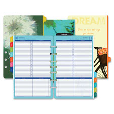 Welcome each new day with a sense of wonder and reverence for life. The Flavia one-page-per-day refill set features stylized imagery, decorative backgrounds, and 12 monthly tabs embellished with inspiring quotations. Each day offers appointment times from 8 AM to 8 PM., a ruled column for to-dos and a ruled column for expenses. Refill includes matching page locator with ruler edge, standard Day-Timer loose-leaf address and phone directory, auto mileage/expense forms, useful reference pages and advance planning pages. Loose-leaf planning pages range 12 months from January to December.