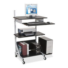 Alekto Workstation allows you to sit down or stand up, reconfiguring it for your convenience. Top shelf adjusts in height from 27" to 52" in 2" increments. Cable management tray assembles on either laminate shelf. Interchangeable CPU holder will fit on right or left side. Retractable keyboard with pullout mouse tray is designed for right-handed or left-handed use. Ideal for medical or industrial facilities. Compact design fits into small work areas. Workstation rolls large 3" casters for mobility and weighs 77 lb.