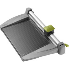 Heavy-duty rotary trimmer handles large-size projects. Effortlessly trims from one sheet of tissue up to 30 sheets of 20 lb. bond paper. Also cuts laminated materials, cardstock, matboard and foam board. Paper clamp eliminates air that fans pages and holds paper firmly in place to ensure precise cuts. Ergonomically designed blade handle keeps fingers away from blade. Enclosed stainless steel rotary blade precision cuts in both directions. Adjustable paper guide, alignment grid and ruler with imperial metric measurements help position sheets. Offers a sturdy metal base.