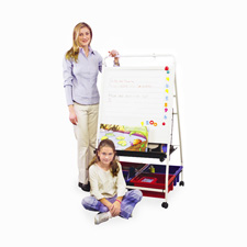 Teacher's Learning Center-2 offers a magnetic dry-erase surface. Magnetic pad is made with 1" permanent penmanship lines. Pads easily attach and detach from the surface. Integrated wire rack to store big books. Retractable big book holder includes a built-in marker tray. Four hooks are included to use paper flip charts. Includes four colorful tubs made of recycling materials. Ample storage tray includes a built-in pencil tray on each side. Locking casters allow easel to be moved from classroom to classroom.
