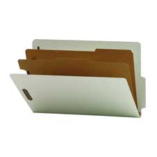 Create a file within a file using classification folders. Sturdy dividers with fasteners on both sides let you store information under several subdivisions in a single folder. Fasteners on the front and back panels add two more filing surfaces. The dividers have tabs for identifying subdivisions. Perfect for project files, personnel files, real estate, accounting or banking files. Folders have 1/2" tabs, 2" expansion, rounded top corners, matching-color Tyvek tape, 2" prong K-style fasteners in positions 1 and 3. Made of 25 point Pressboard stock. Folders are made with a high percentage of recycled material. Dividers offer 3/8" high tabs, 1/3 cut tabs, and 1" twin-prong fastener in position. Made of 17 point kraft stock. Dividers are fully taped to gusset.