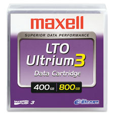 LTO Maxell Ultrium 3 features a native transfer rate of 40-80MB/sec and native capacity of 400GB (80-160MB/Sec and 800GB compressed). Cartridge memory is 4KB LTO-CM. This latest generation provides improved archival application, superior durability and very low error rate levels. Offers backward compatibility with earlier generations, allowing LTO-3 end-users continued access to Ultrium 1 and 2 tape archives and providing investment security for years to come. Features write-once WORM functionality, allowing secure backup and storage of critical data for legal and regulatory compliance. Extremely smooth, high-rigidity PEN base film to ensure smooth magnetic surface and low noise levels for high-density data recording. The PEN base film allows improved dimensional stability during drive operation for more accurate recording and excellent archival storage. LTO 3 delivers extremely high output and enhanced stability for signal reading and writing.