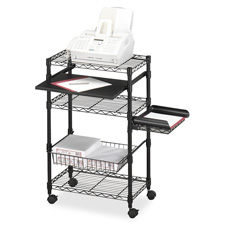 Multipurpose wire cart is mobile to transport and store small machines, projectors and more. Design includes three stationary shelves, slide-out basket, sliding posting shelf and adjustable flip-up shelf on the side. Wire cart rolls easily on four casters, and the two locking casters can secure it to a location.