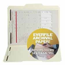 Preserve your information today and in the future. EverFile paper is a unique stock developed especially for the long-term preservation of your important documents. Folder with fastener is acid-free and lignin-free and remains chemically stable for 50 years or more. Won't cause your stored documents to age and become brittle. File folder is also treated with an antimicrobial coating to resist mold, mildew and associated odors. Meets PAT standards recommended for storage of photographic paper or film. Folder has 1/3 cut tab and contains two 2" fasteners in positions 1 and 3.