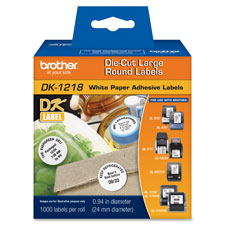 DK Die cut round labels on white continuous film tape are designed for use with the Brother QL-500, QL-550, QL-570, QL-650TD, QL-1050 and QL-1060N.