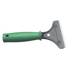 Ergonomic handle of the ErgoTec Scraper fits neatly in hand. Reversible carbon steel blade has blunt edge for hard surfaces and razor edge for paint and tape removal. Handle attaches to all Unger poles for high access cleaning.