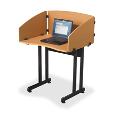 Economical study carrel assembles in less than five minutes. Perfect for libraries and any area where privacy is needed. Laminate side panels are made of 5/8" thick particleboard. Worksurface is made of 3/4" particleboard with a grommet hole in back of top. Frame is made of powder-coated steel and includes leveling glides.