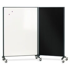 Two-sided rolling room divider features a premium porcelain magnetic whiteboard with flip chart pad holders on one side and fabric-covered bulletin board. Perfect tool for presentations and meetings. Durable fabric bulletin surface allows you to display items. String boards together to act as a room divider. Boards nest together for storage. Design offers a graphite metal frame, sleek narrow footprint and easy mobility with four wheels. Room divider includes four Quartet markers, eraser and attachable magnetic marker tray.