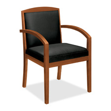 Elegantly styled guest/reception chair features a tall back, hardwood frame with curved arms and leather upholstery on seat and back panel. Seat and back are made of padded plywood. Seat measures 22" wide x 18-1/4" deep x 19-1/2" high from the floor. Back size is 18-1/2" wide x 15-1/4" high from the seat. Distance between arms is 20-1/4". Guest chair is part of the basyx VL850 Reception Series.