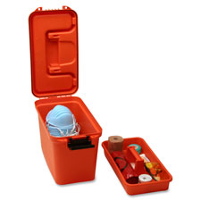 Lockable first aid storage case is lightweight, rustproof, scratch-resistant, water-resistant and chemical-resistant. 360-degree, water-resistant rubber lid seal has a heavy-duty, cam-over latch so your contents stay secure. Special holes on each side of latch opening accommodate padlocks or other securing devices. Top storage area is perfect for reaching smaller items without having to open the case. The 2" deep, lift-out tray inside the storage case has a center handle to transport items to other areas. Deep storage area below the tray is great for storing larger items. Top handle of the first aid storage case folds down flush to allow easy stacking.