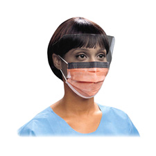 Orange pleat-style mask comes with ear loops and a visor. The wraparound splashguard, visor and orange mask resist fluid penetration upon impact and offer extra peripheral protection on both sides, as well as unique protection against small particulate matter. Mask is latex-free and fog-free.