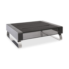 Mesh monitor stand controls desktop clutter and raises monitor to eye level. Supports up to 35 lb. Design features flat black mesh metal highlighted with silver accents for a modern look. Monitor stand design blends perfectly into every office landscape. Includes cord organizer. Hub compatible.