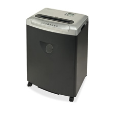 Cross-cut shredder is perfect for small to medium-size offices. Durable steel cutters shred up to 30 sheets into small 2/13" x 1-50/87" (4mm x 40mm) confetti pieces in one pass. Shredder shreds 5-1/4' per minute and accepts paper, CDs, DVDs, floppies, paper clips and staples. Duty cycle offers a maximum runtime of 10 minutes with a 60-minute cooldown. Auto-stop function activates when jammed so you can use the reverse button to clear jams. Infrared sensor controls the auto/on feature. Shredder is equipped with safety switch and thermal switch to prevent overheating. Metal gearing provides cutting strength and longevity. Pullout bin holds 8-12/19 gallon (32-7/10 liter). Shredder also features stacked cutting heads, 9-1/2" wide throat, 60-decibel sound level and 9-3/8" paper entry.