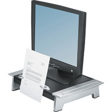 Monitor riser places your monitor at a comfortable viewing height. Height adjusts up to 2-1/2" (between 4" to 6-1/2") for optimal viewing angle. Stow laptop underneath. Design features in-line copyholder, three-way height, tilt adjustment for laptops, storage tray, and nonskid rubber feet. Monitor riser supports monitors up to 80 lb. or laptops up to 10 lb.