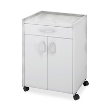 Mobile refreshment center features a drawer and storage compartment with a double-door design. The top can hold up to 100 lb. The bottom shelf and interior shelf can each hold 100 lb. The drawer can hold 50 lb. Large, heat-resistant countertop has a 1-1/4" high raised lip to catch spills. This top worksurface area measures 21-1/2" wide x 17" deep. Refreshment center rolls on four 2" casters (two locking) and is made of 3/4" wood with a laminate finish and with a high percentage of recycled material.
