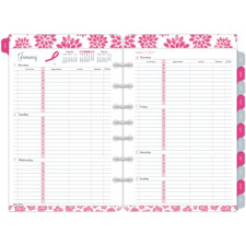 Show your support for breast cancer research with a Pink Ribbon two-page-per-week refill. Day-Timer will donate a portion of the proceeds from this product to The Breast Cancer Research Foundation. Sophisticated black-and-white floral bouquets tied with a soft pink ribbon adorn every page. Monthly tabs have a coordinating design. The easy-to-use two-page-per-week format shows the entire week on two facing pages with lined daily entries, hourly appointment times from 8 AM to 5 PM and past, current and future months reference. Tabbed monthly dividers are ideal for advance planning. Refill includes reference pages and a page locator and ranges 12 months from January to December.