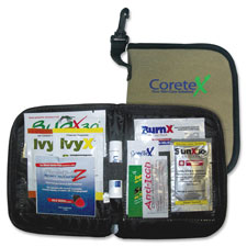 Outdoor Skin Protection Kit includes three SunX towelettes, one SunX lip balm, two IvyX pre-contacts, two IvyX post cleanser towelettes, two BugX insect repellent towelettes, two BurnX first aid gels, one StingX relief packet, two Corium hand sanitizer and one Corium dual anti-itch.