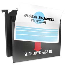 Hanging file box with clear overlay features patented flip-out hanging levers. These levers allow the file box to be hung within all standard hanging file systems. Back panel allows easy customization and accommodates 8-1/2" x 11" sheets. Includes clear plastic tab for identifying contents.
