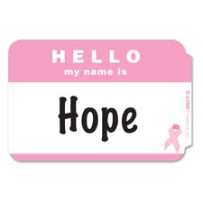 Pink "HELLO my name is" badges promote Breast Cancer Awareness. Support the search for a cure with pink peel and stick name badges. Pressure-sensitive name badges are ideal for small meetings, seminars and conferences. Write or type name in space below thick pink border. Unique tabbed edge makes it easy to peel the backing off these self-adhesive name badges. Special paper adheres to most fabrics. Do not apply to vinyl, leather, suede, corduroy or silk.