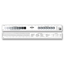 18" graphic arts ruler is two-sided and features measurements in inches, picas, and points. Rule weights range from hairline to 12 points. Ruler features proofreader's marks, decimal and millimeter equivalents chart, halftone/color density guide, pica/inch conversion guide and zero center scale. Made of opaque plastic and laminated for durability.