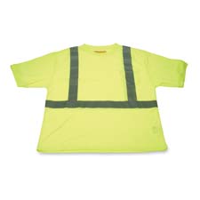 Crew-neck rawhide safety T-shirt is made of polyester sports knit material. Fluorescent lime-yellow material provides great visibility. T-shirt features a left breast pocket and is machine washable. Line-dry the T-shirt. Safety T-shirt also meets ANSI 107-2004 Class 2 standards.