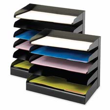 Document tray offers a convenient place to store and organize open projects, file folders and paper supplies. Slanted shelves are 15" wide x 8-3/4" deep x 2" high to accommodate documents up to legal-size. Finger notch-outs provide convenient access to contents. Rubber feet protect work surface. Made of all-steel construction with a durable powder-coat finish.