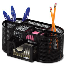 Mesh Oval Pencil Cup offers divided compartments for easy organization of different writing utensils. Additional compartments easily accommodate paper clips and small accessories. Drawer adds more storage for 3" x 3" note pads or other small items. Pencil Cup is made of rolled mesh steel in a criss-cross design.