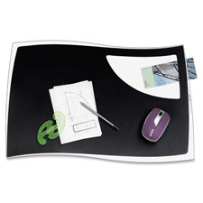 Desk mat features a solid black design with clean lines. Antiglare surface is easy on the eyes. Unique transparent window in corner is ideal for protecting and keeping sight of telephone lists, notes, appointments and photos. Fine-grained finish gives optimum writing quality with ballpoint, felt-tip, gel or ink pen and offers a surface for any type of mouse. PVC-treated desk mat features a coating of antiskid micro-droplets that cling to the desktop but can be repositioned easily at any time. Mat encourages a fine circulation of air to avoid discoloration of wooden desks. Desk mat is not deformed by heat from hot coffee or tea mugs and does not show finger marks. Mat is made from 100 percent recyclable, washable, shock-resistant polystyrene.