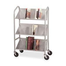 Shelf cart features three sloped shelves to easily carry books and manuals. Design includes three 9-1/2" deep sloped shelves with six steel dividers and 12" clearance between shelves. Shelf cart rolls on 4" casters. Weighs 53-1/2 lb. Made of metal.