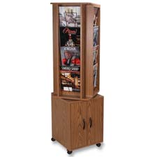 Rotary magazine rack offers 16 pockets to display and store magazines and a storage cabinet below. Rack rests on a ball bearing track and turns 360 degrees for easy access. Hidden storage area for additional literature is located on the top of the rack hidden behind magnetic closure. Rotary magazine rack rolls on four casters (two locking) for easy turning and smooth cornering.